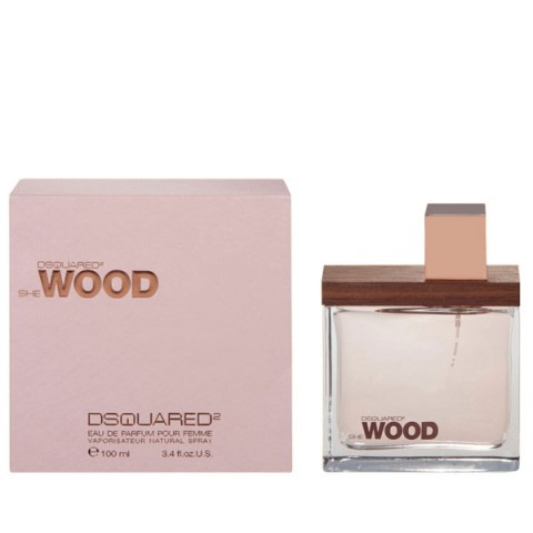 She WOOD اولین عطر زنانه DSQUARED است که دارای ویژگی فریبندگی و درخشندگی است. این عطر سنگین و با کلاس در سال ۲۰۰۸ مخصوص خانمهای مشکل پسند و خاص ساخته شده که به دنبال رهایی و یک حس جدید هستند. بطری این عطر از چوبهای نرم درخت گردو در شمال آمریکا به شکل مربع ساخته شده و رنگ صورتی آن تقدیم به خانمهای عاشق می شود.